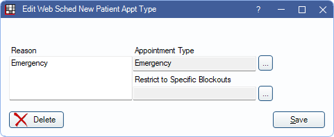 The Web Sched New Pat Appt Types definition determines the list of available Reasons for Appointment options patients select from when scheduling an appointment using the Web Sched New Patient feature.