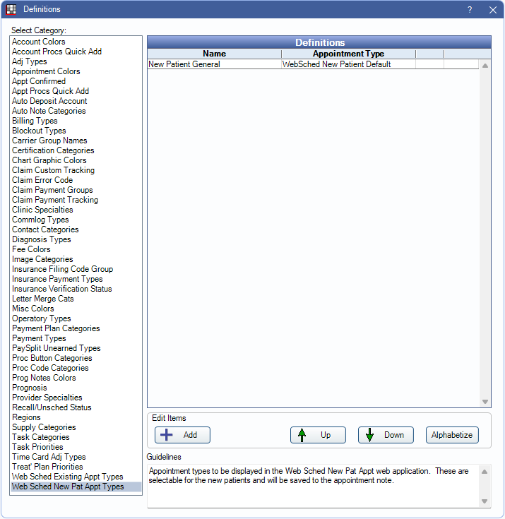 Definitions: Web Sched New Patient Appt Types