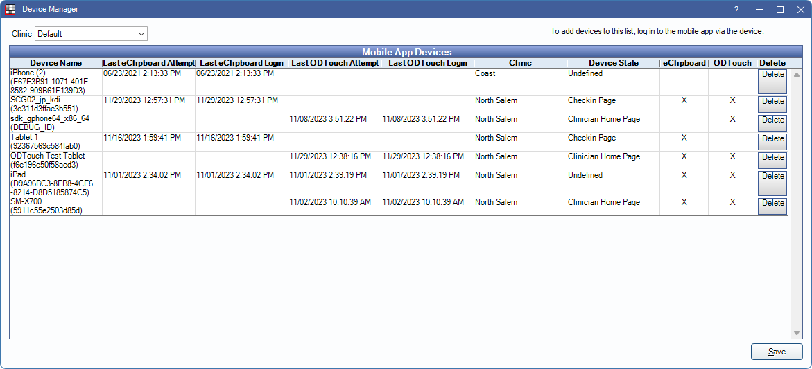 Manage tablets and smartphones that have logged into the database via eClipboard or ODTouch.