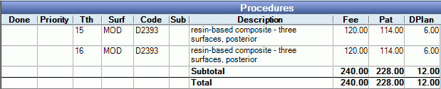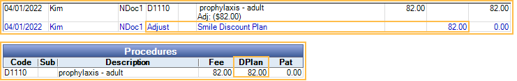 Once procedures are set complete, adjustments are automatically created for any discounted procedures. The adjustment that is created matches the amount that was in the DPlan column for the procedure in the Treatment Plan.