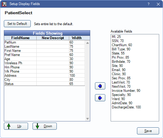 - Patient Select: Columns in the Select Patient grid.