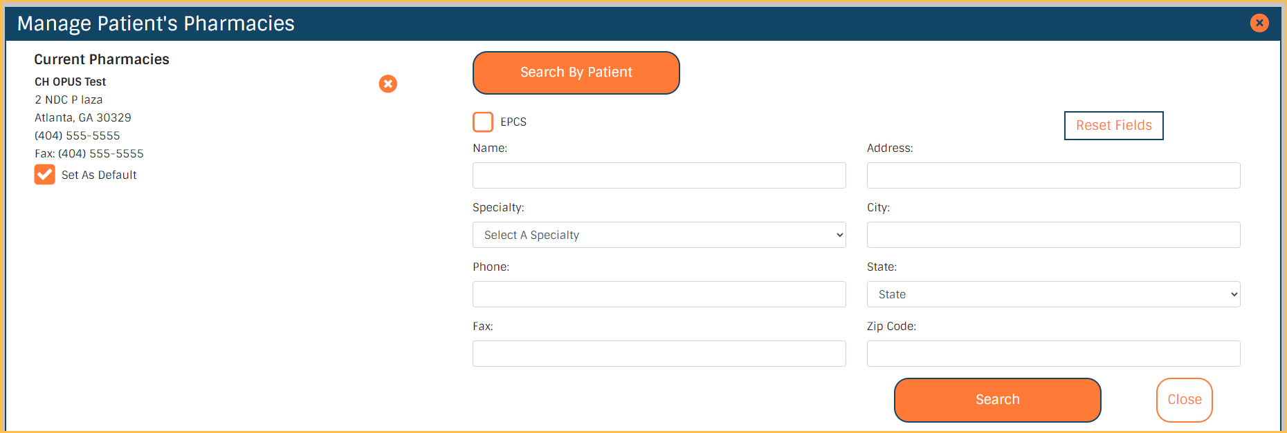 - Use the Search By or Specialty dropdowns to filter the pharmacy list, or enter the pharmacy info in the provided fields. Select EPCS in Specialty for EPCS pharmacies.