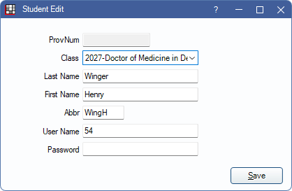 - User Name: The user name the student uses to Log On to Open Dental. Defaults to the student's ProvNum but can be manually changed.