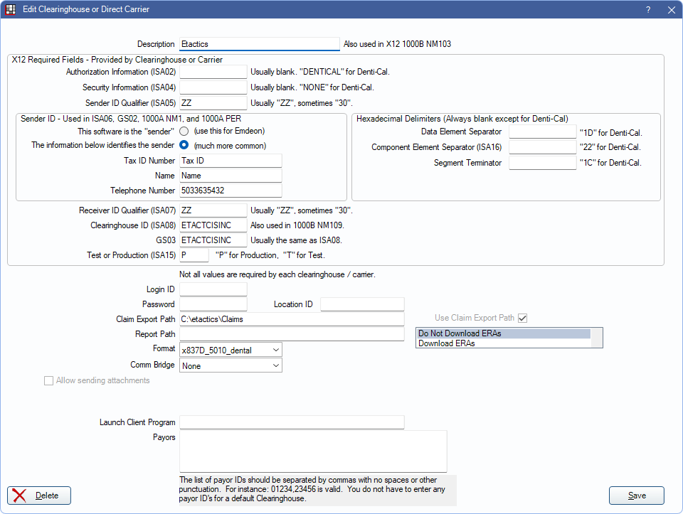 The Etactics clearinghouse must be manually added to Open Dental. Visit their website at www.etacticsinc.com.