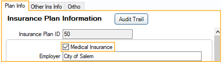 On the Insurance Plan, Plan Info Tab, check the Medical Insurance box. This is used for medical and institutional claims, and it controls whether claims go out in dental format or in medical/institutional format. Also set the Claim Form to UB04 or 1500, in case paper claims are printed.