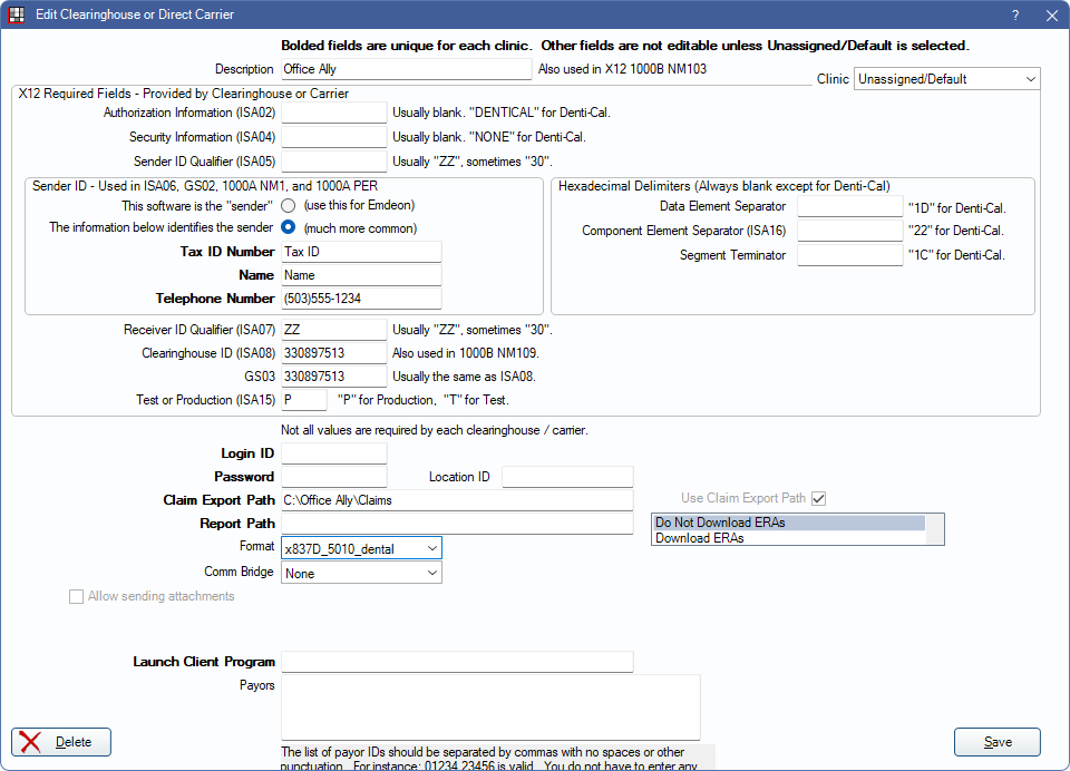 Office Ally must be manually added to Open Dental. Set up the clearinghouse as follows: