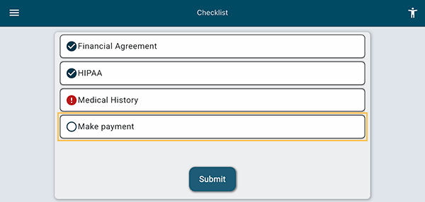 Alternatively, this option can automatically be added to the Check-in checklist when Allow payment when patient is checking in is enabled in eClipboard Setup. Another checklist item (e.g., patient forms or patient photo) must display for patients to view payment information.