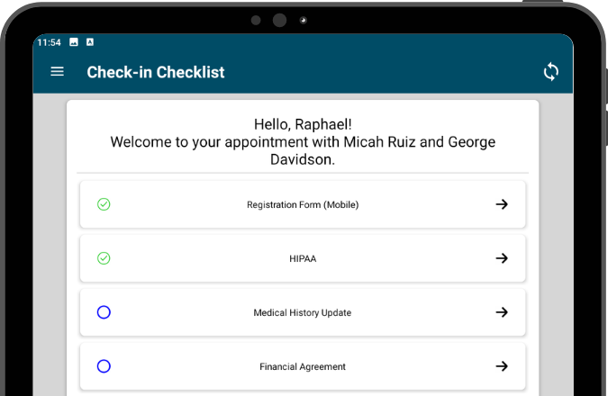 Once at the Check-in Checklist, the patient can begin completing items. As items are completed, a green checkmark displays.