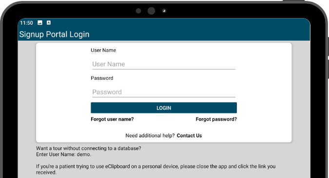 To associate eClipboard with your practice, enter the Signup Portal Credentials. These credentials are only needed the first time you login to eClipboard, or if you have manually logged out of eClipboard.