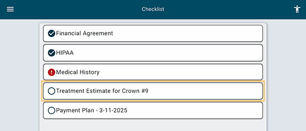 Once the patient opens the Treatment Plan checklist item or the Treatment Plan is opened using the Mobile Unlock Code, the Treatment Plan sheet is displayed on screen.