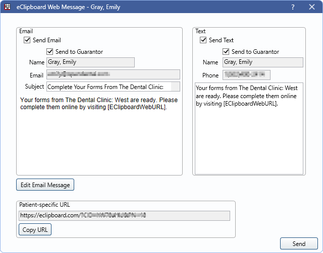 Click Send to send an email, text, or both to the selected patient.