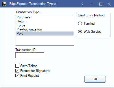 - In the EdgeExpress Transaction Types window, Select Void and enter the Transaction ID.