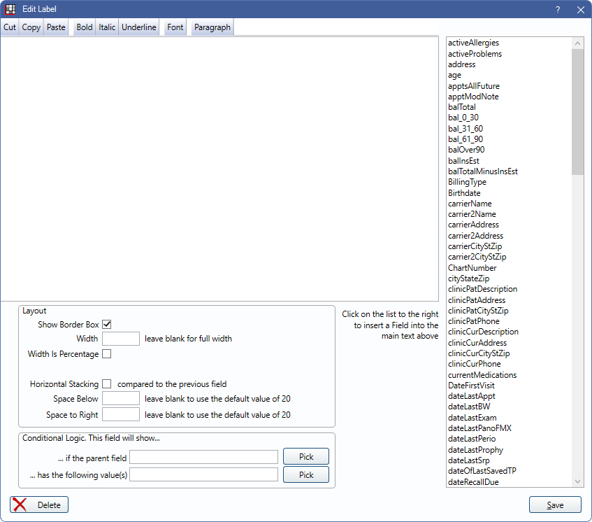 The Layout options determine the appearance and behavior of the Label field. See eForm Field Layout for details.