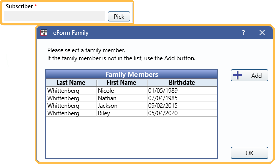When in use on an eForm, the patient clicks Pick to select from other family members.