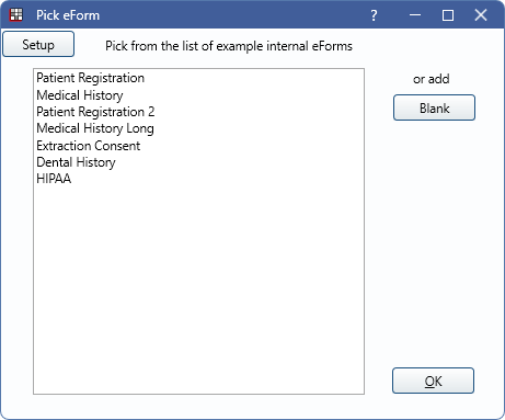 Setup: Click to open the eForms window. Only displays when adding an eForm to a patient.