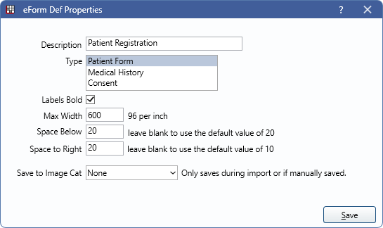 - Save to Image Cat: Select an image category to save this eForm to when filled from the Fill eForm window, eClipboard 25, or eClipboard Web. The recommendation is to leave the category as None and access forms from the Chart Module instead.
