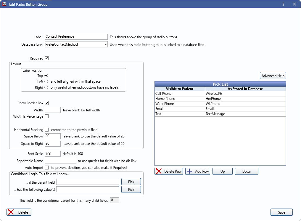 Database Link: Where patient input information imports into the database. If None is selected, data can be entered but cannot be imported. Database links share many of the Sheet CheckBox Field Names from Sheets.