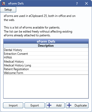 eForms are patient forms used with eClipboard 25 or eClipboard Web.