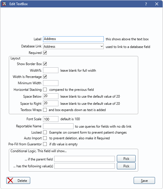 Use Text Box settings to determine how the selected field behaves and interacts with other fields.