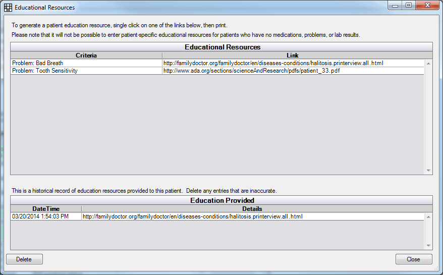 Click Print, then provide the resource to the patient. A dated log entry will list under Education Provided and the numerator in Measure Reports for Education will increase.