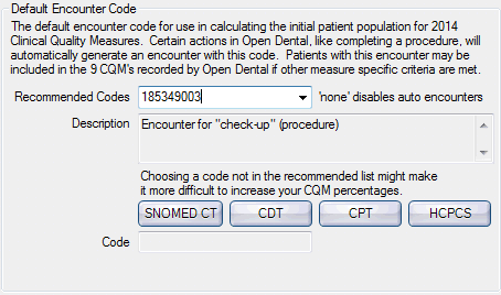 Set a default encounter code before your EHR reporting period to automatically generate a EHR Encounters (based on the code) every time a procedure is set complete. Encounters affect the denominator of EHR Clinical Quality Measures. If you do not select a default code (none) no encounters will be created, and CQM values will be zero.