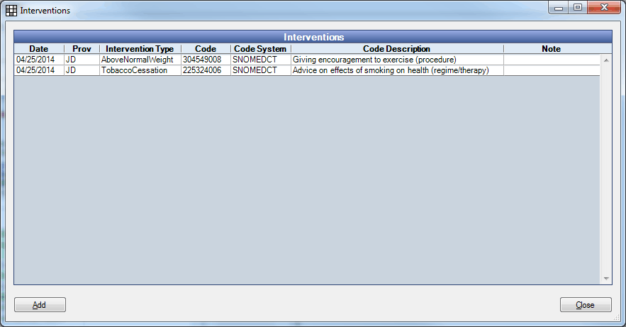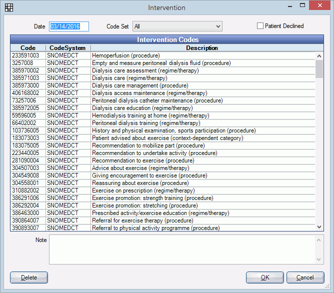 - Double click an intervention to open the Intervention window. Only the Date, Patient Declined checkbox and Note field will be active. The current intervention will be highlighted.