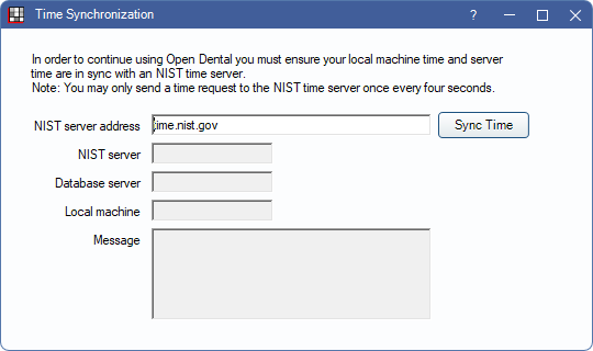 The specific times for each server are listed. If Open Dental is unable to connect to the NIST time server, the operation may time out.