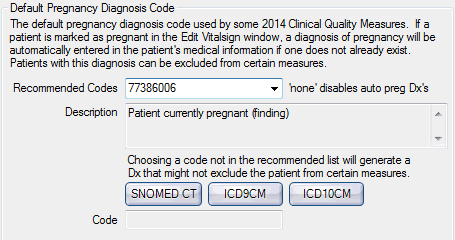 Pregnancy codes exclude patients from some EHR Clinical Quality Measures (CQMs). The default pregnancy code is used automatically when you exclude a patient from a EHR Vital Signs BMI exam due to pregnancy. A diagnosis of pregnancy will also be added to the Problems list with a start date equal to exam date, if an active diagnosis already doesn't exist in the list.