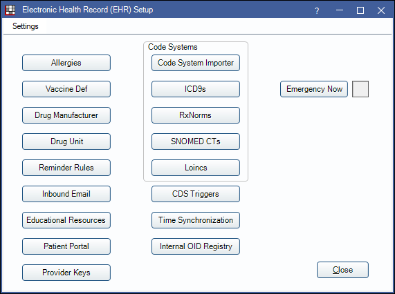 Before entering patient data for EHR, users must define information so that it is available for selection. Several setup areas are accessed from the EHR setup window.