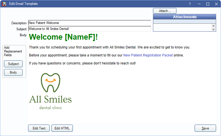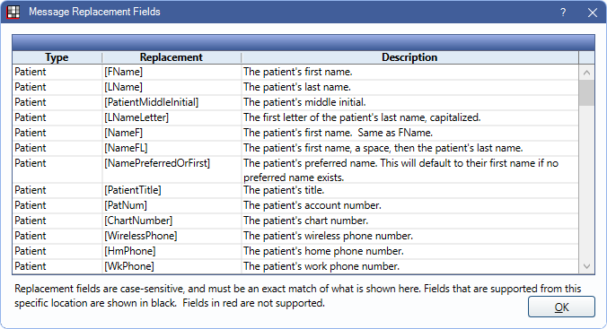 - Subject Fields / Body Fields: Insert replacement fields into the Subject or Body. Message replacement fields pull information from the database to insert into the message (e.g., insert [ApptDate] to automatically insert appointment date).