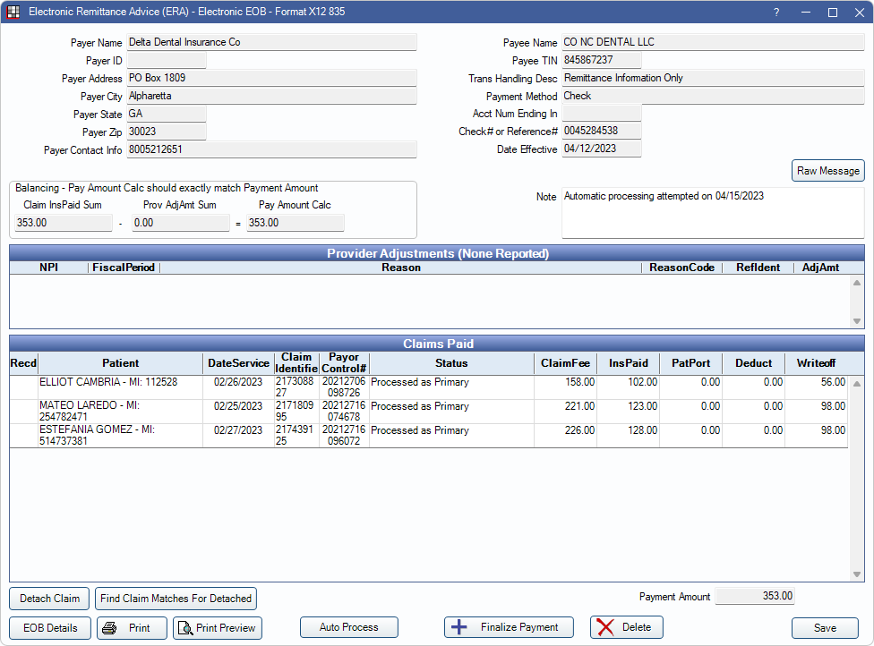 - Auto Process: Click to receive payment for all claims on the ERA and finalize the batch insurance payment. A popup indicates how many claims were processed successfully, including any errors that need resolved. Correct any errors and click Auto Process again or receive claims manually as needed. For additional information see ERA Workflow.