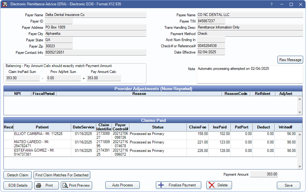 - If all claims on the ERA Auto Process successfully, payment is automatically finalized.