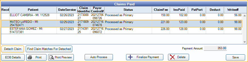 Note: If a claim payment is missing the X in the Recd column, continue with the steps below to detach the claim and finalize the payment outside the ERA window.