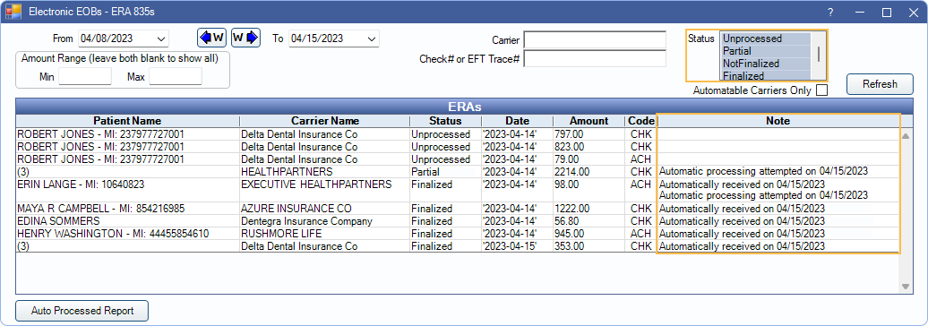 - To see ERAs that have been automatically processed and finalized, open the ERAs window. Select the Finalized status filter. ERAs that have been finalized by automatic process display a note. A note also indicate any failed auto processing attempts.