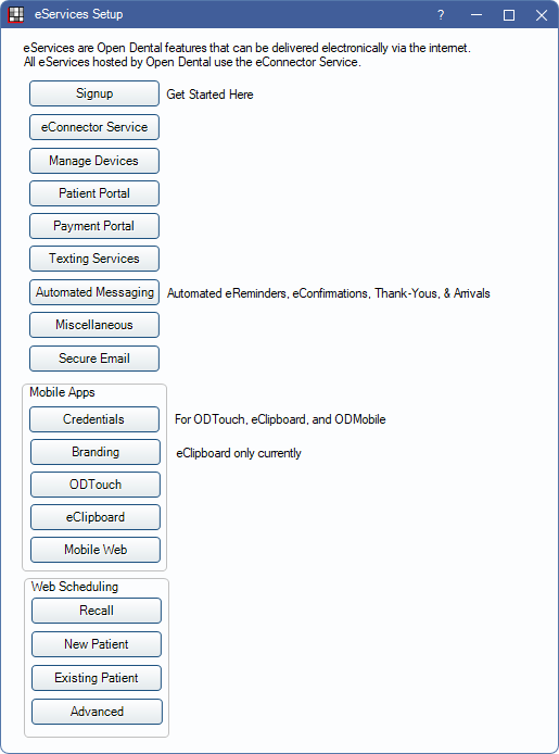 - eConnector Service: Install and monitor the eConnector. This service is used by, and required for, all eServices hosted by Open Dental.