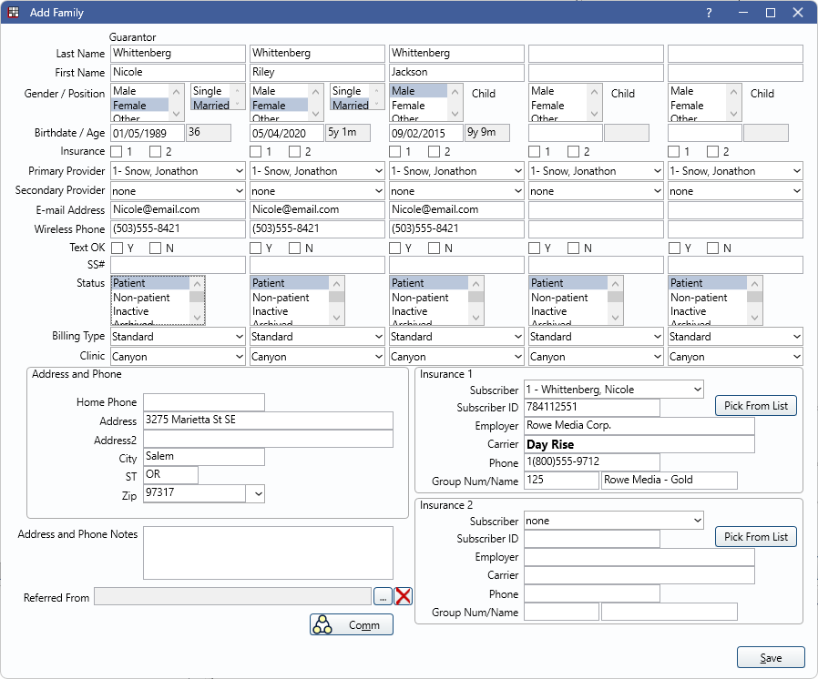 - Email Address: Enter an email address for each patient. When Autofill patient's email with the guarantor's when adding many new patients is enabled in Preferences, entering the guarantor's email address pre-fills the email for all family members.