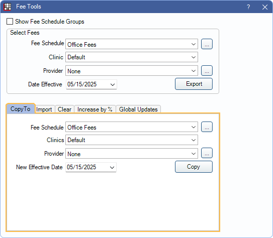 Use to copy fees in one fee schedule to a different fee schedule. Only fees that exactly match the selected criteria will be copied. Users can copy only global fees in a fee schedule or further narrow criteria to only clinic and/or provider-specific fees. As a preventive measure, before changing fees in a fee schedule (e.g., Fees Increase or Fees Import), we recommend creating a backup copy of the original fees.