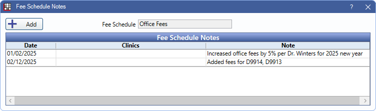 Click Add to create a new Fee Schedule Note or double-click an existing note to edit.