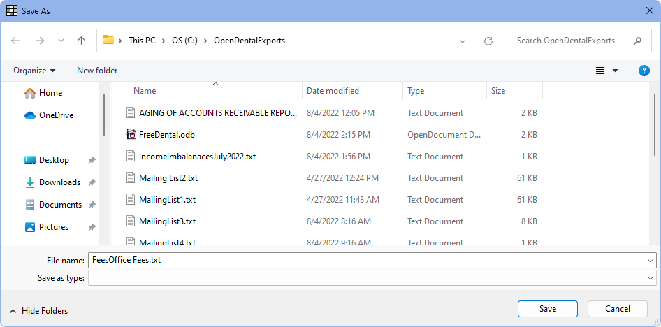 - Select the location and file name and click Save. By default, it is saved as a text file in the OpenDentalExports folder.