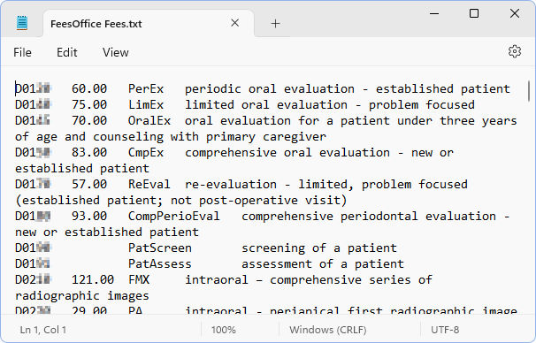 To change fees, open the saved file, make the changes, and then save the file. If making changes to import back into Open Dental, only code and fee changes are recognized. See Fees Import for instructions on importing any changes.