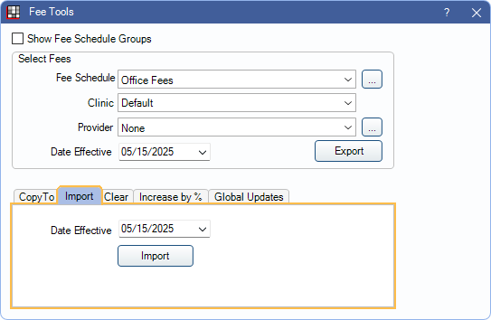 - In the Import area, set the Date Effective. Set the date the imported fees will take effect. To make fees effective immediately, enter today's date. If a future date is entered, fees will take effect on the applicable date.