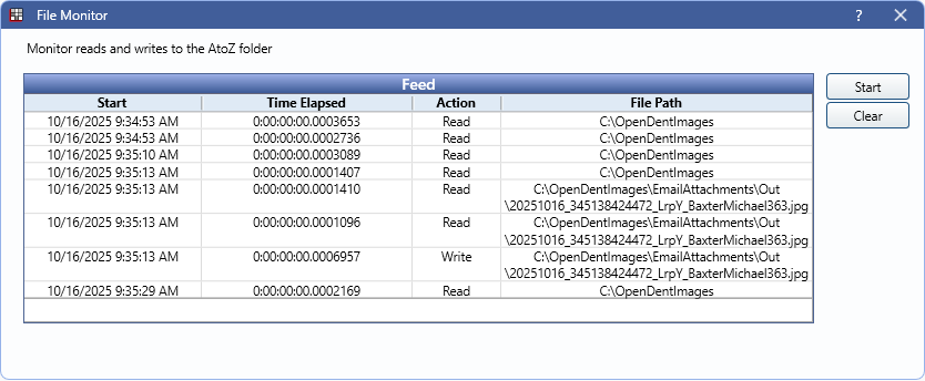The File Monitor window shows read and write actions to the AtoZ folder (i.e., OpenDentImages) as they execute in real-time.