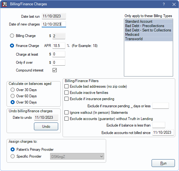 Run: Click to process billing or finance charges to all families meeting the filter criteria.