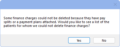 Billing and finance charge adjustments attached to a Payment or Payment Plan cannot be deleted with this tool. To view a list of patients with these adjustment types attached to payment splits and Payment Plans, click Yes when prompted.