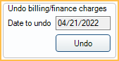 Use the Undo button to undo the most recent charges (finance or billing). All adjustments made on the same date, which have the same adjustment type, are deleted. Finance/Billing charges for a different date must be undone manually. Use the Finance Charge Report to identify the adjustments made on that date.