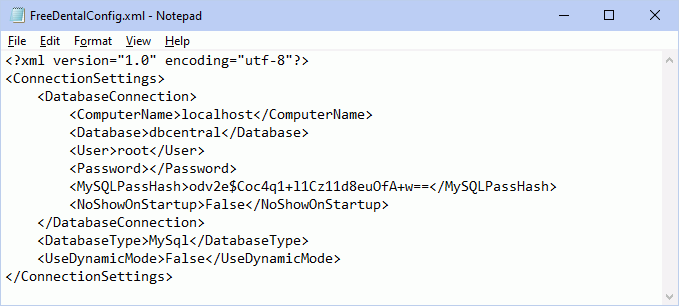 When selecting options on the Choose Database Window, information is stored in this file. If using advanced options such as Middle Tier or connection strings, it can also change the tags in the file. The file is located in the Open Dental installation directory. If it is missing or deleted, Open Dental recreates the FreeDentalConfig.xml the next time the program is run.