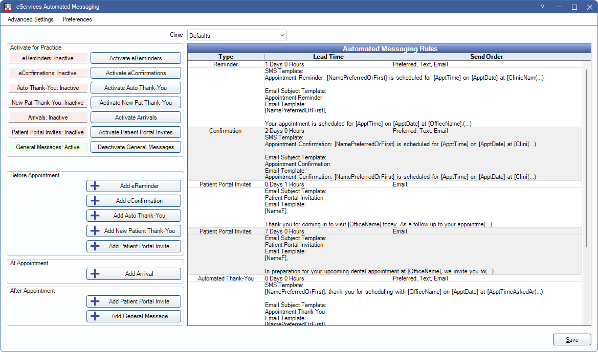 An example of a general message could be a text that goes out after the appointment inviting the patient to leave a review. Emailed messages can be sent at no additional cost. To send messages by text, Integrated Text Messaging is required and a per text message fee applies. See Fees for Support and Services.