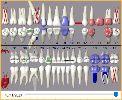 Drag the slider bar under the chart to show historical changes to the patient's tooth chart. Procedures that were originally in the Treatment Planned procedure status appear on the chart as of the Procedure Date TP. Other statuses appear as of the Date Entry.