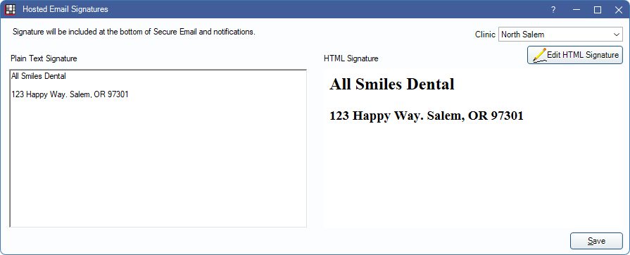 HTML Signature: Displays the HTML signature used for the selected clinic.