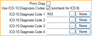Set the code system for a specific procedure on the Procedure Info - Medical tab by checking or unchecking Use ICD-10 Diagnosis Codes (uncheck for ICD-9). The field labels for diagnosis codes will change to reflect the setting.